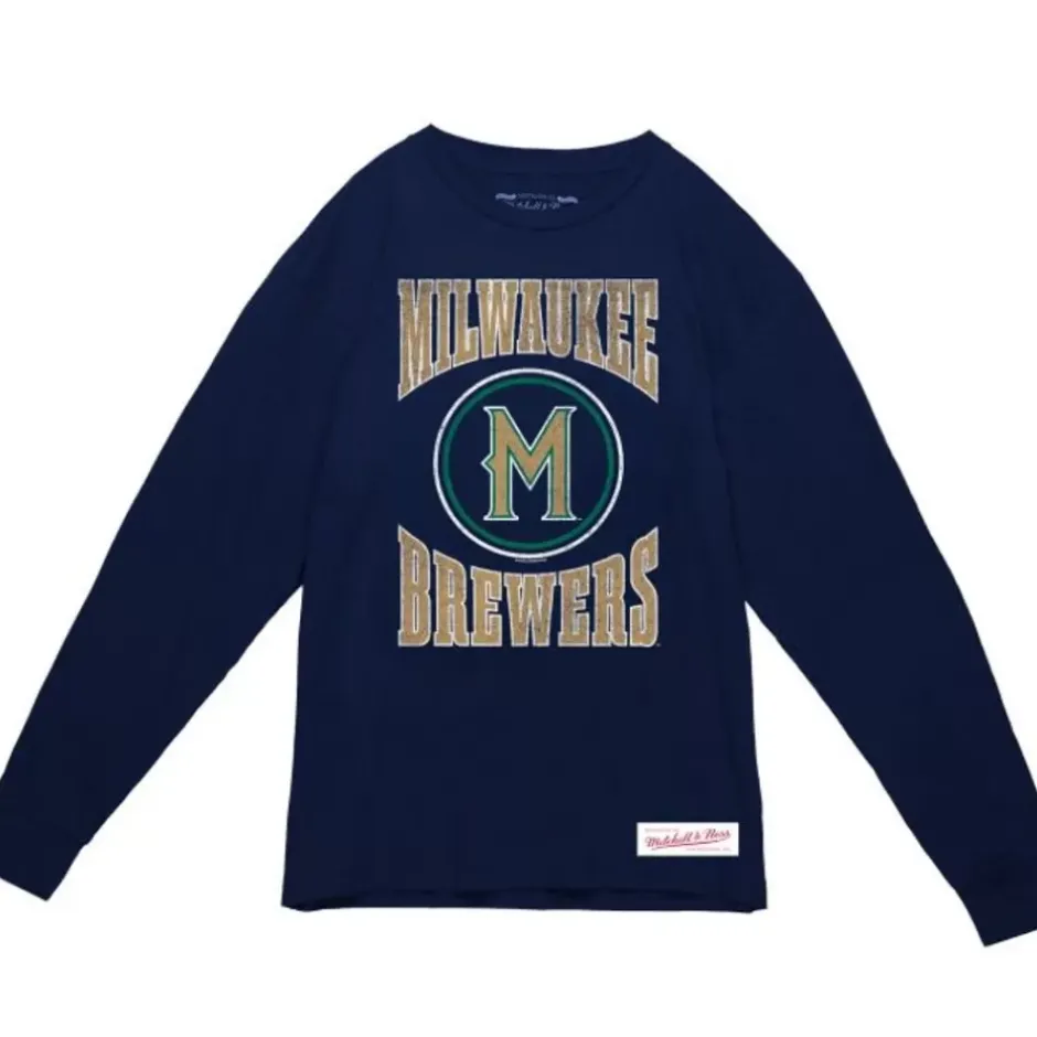 Men Mitchell & Ness T-Shirts & Tops-Arched Logo Slub Ls Tee Milwaukee Brewers